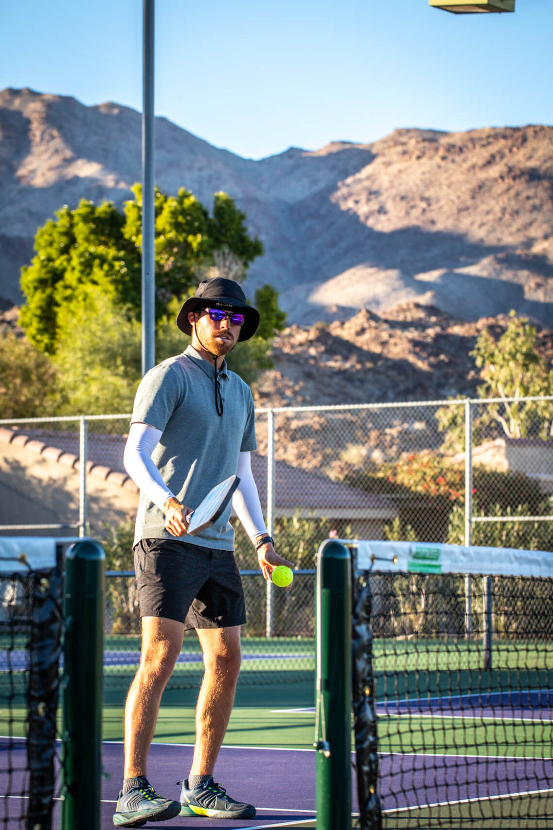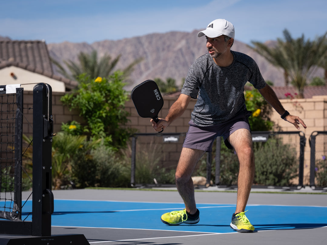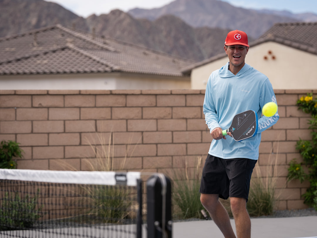 Morningtime play at Palm Desert Resort on the 4.5 courts. Top-spin dink to his opponent. Using his new Joola - Collin Johns - Paddle.